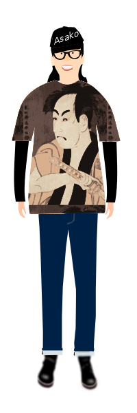 This features a woman wearing a shirt with an Asian man's face on it. She is standing in front of a wall, and her outfit includes blue jeans and black shoes. Her glasses are visible as well, adding to the overall style of her attire. The shirt has long sleeves, which adds to its unique appearance.