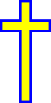 This features a large, blue and yellow cross that is prominently displayed. The cross has a distinctive yellow background with the blue outline surrounding it. This unique design creates an eye-catching contrast between the two colors. The cross appears to be placed vertically in the image, drawing attention to its striking appearance.