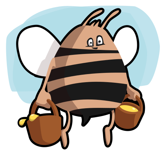 This features a cartoon bee with a big smile on its face, carrying two buckets of honey. The bee is brown and black in color, and it appears to be enjoying the task at hand. It's holding one bucket in each of its arms, showcasing its ability to multitask while transporting the honey. This whimsical illustration captures a playful moment with a cute character that is likely meant for entertainment or as part of an advertisement.