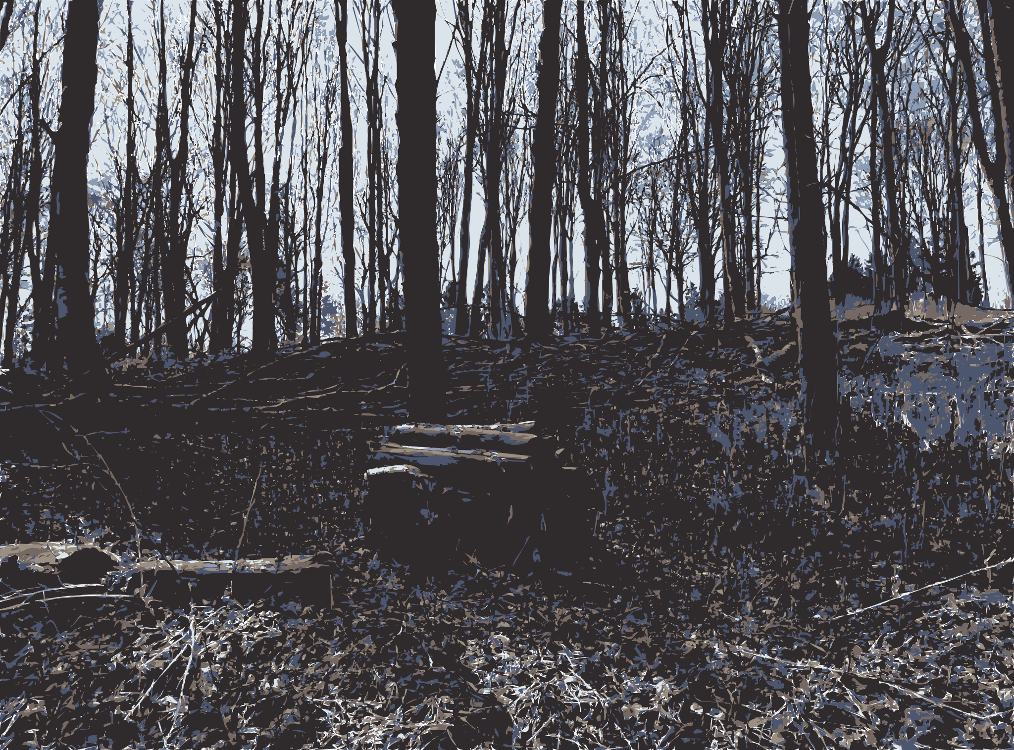 This features a forest with many trees, some of which are bare. A large log is lying on the ground in the middle of the scene, surrounded by several other logs scattered throughout the area. The overall atmosphere appears to be somewhat desolate and abandoned, as if the forest has been left untouched for an extended period. The black and white nature of the photo adds a sense of timelessness to the scene, emphasizing the natural beauty of the landscape.