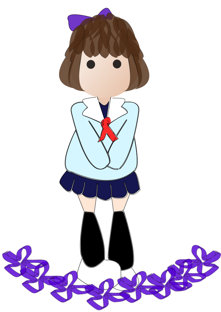 This features a cartoon girl dressed in a school uniform, standing with her hands on her hips. She has short brown hair and is wearing a purple bow. The girl's feet are positioned at the bottom of the illustration, surrounded by a purple design. This whimsical drawing captures the essence of a young girl in a school uniform, showcasing her confident posture and unique style.