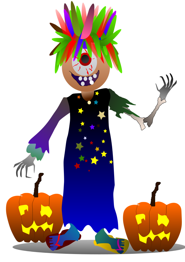 This features a colorful and creepy cartoon character with an evil grin, standing in front of two pumpkins. This character is wearing a black dress adorned with stars, giving it a spooky appearance. It appears to be the main focus of the scene, drawing attention due to its unique design. The two pumpkins are placed on either side of the cartoon character, adding an element of Halloween decoration to the image.
