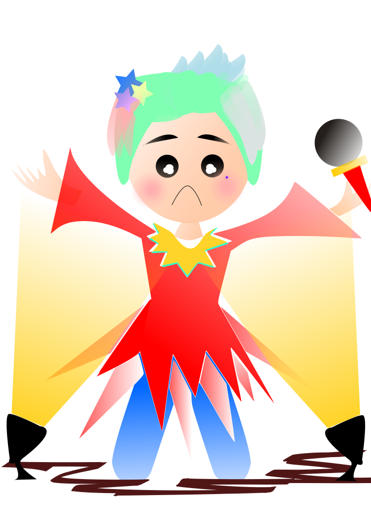 This features a cartoon character, possibly a superhero or a singing star, wearing a red and yellow costume. This character is holding a microphone in one hand while standing on the ground with their legs spread apart. They appear to be posing for a picture, possibly as part of an advertisement or promotional material. The cartoon character's facial expression suggests that they might be feeling sad or disappointed, adding a touch of emotion to the scene.