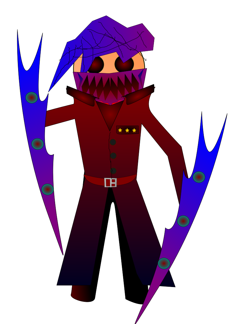 This features a character with an evil appearance, wearing a mask that covers only half of its face. This character is holding two large blue and purple blades in its hands, giving it a menacing look. The character's outfit includes a red jacket, adding to the overall dark and mysterious atmosphere of the scene.