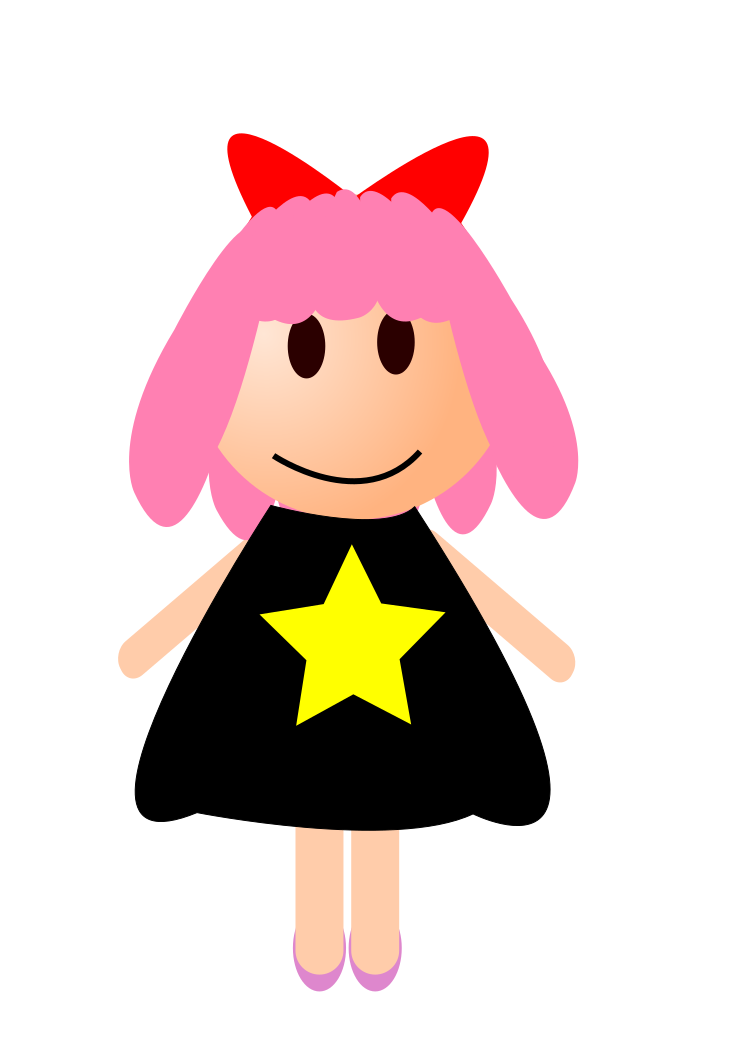 This features a cartoon girl with pink hair and a red bow on her head. She is dressed in a black dress adorned with a yellow star, giving her an animated appearance. The girl appears to be standing against a light brown background, which adds depth to the scene. Her outfit and overall design make for an eye-catching and playful image.