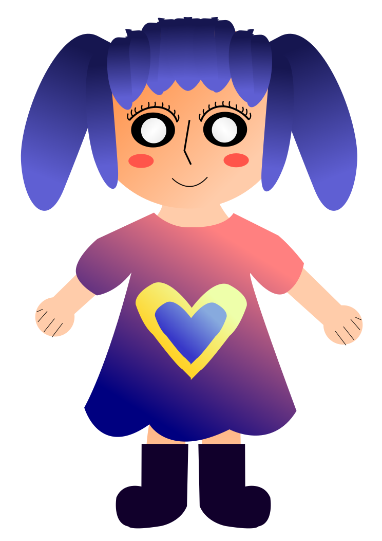 This features a cartoon character with blue hair, wearing a red and yellow heart-shaped dress. The character has a smiling expression on its face, giving the impression of being happy. The outfit is designed to resemble a little girl's clothing, adding a playful touch to the overall appearance.