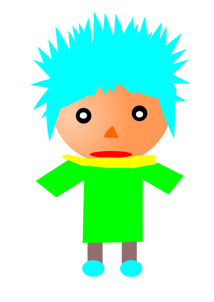 This features a cartoon-like character with spiky blue hair, wearing a green shirt and blue shoes. The character appears to be looking downward or frowning, giving it an animated and playful appearance. The color scheme of the character is predominantly aqua and green, which adds to its lively and cheerful vibe.