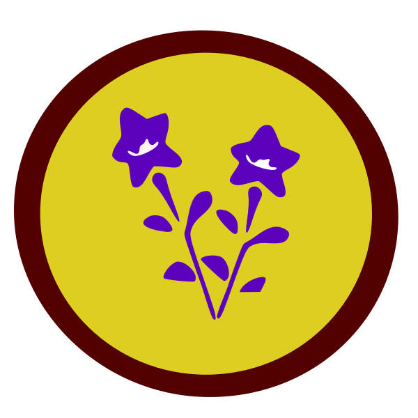 This features a yellow circle with purple flowers in the center. There are three purple flowers, each one slightly overlapping the other, creating an artistic and visually appealing design. The circle has a brown outline that adds depth to the overall appearance of the image. This unique combination of colors and shapes makes it an interesting and eye-catching piece of art or decoration.