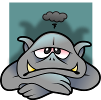 This features a cartoon character, possibly an elf or troll, with a sad and discontented expression. It appears to be under the weather, as there is a black cloud hovering over its head. The character has two sharp yellow teeth, which adds to its unpleasant appearance. The overall scene gives off a sense of melancholy and unhappiness.