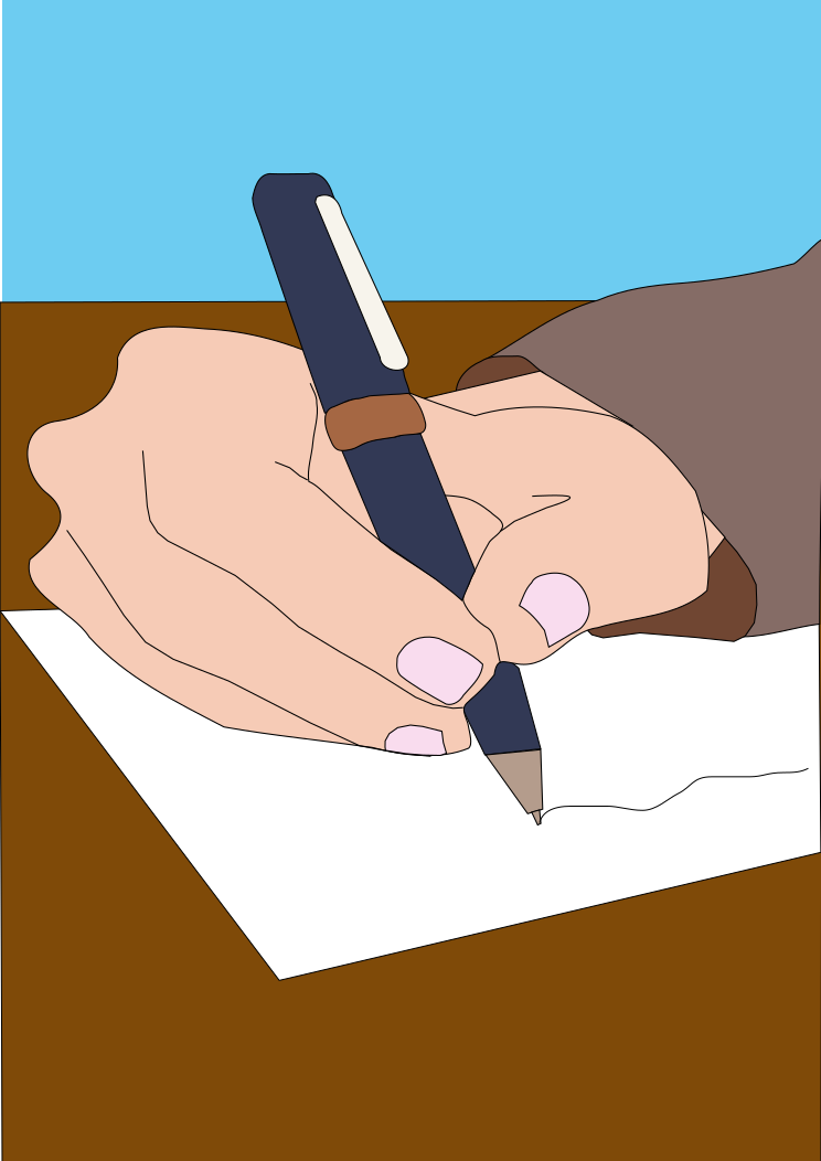 This features a hand holding a pen and writing on a piece of paper. The hand is positioned towards the left side of the scene, with the pen resting in its grasp. The paper appears to be white and is placed on a surface that spans across the entire background of the image. This artistic representation captures the essence of someone engaging in writing or drawing activities.