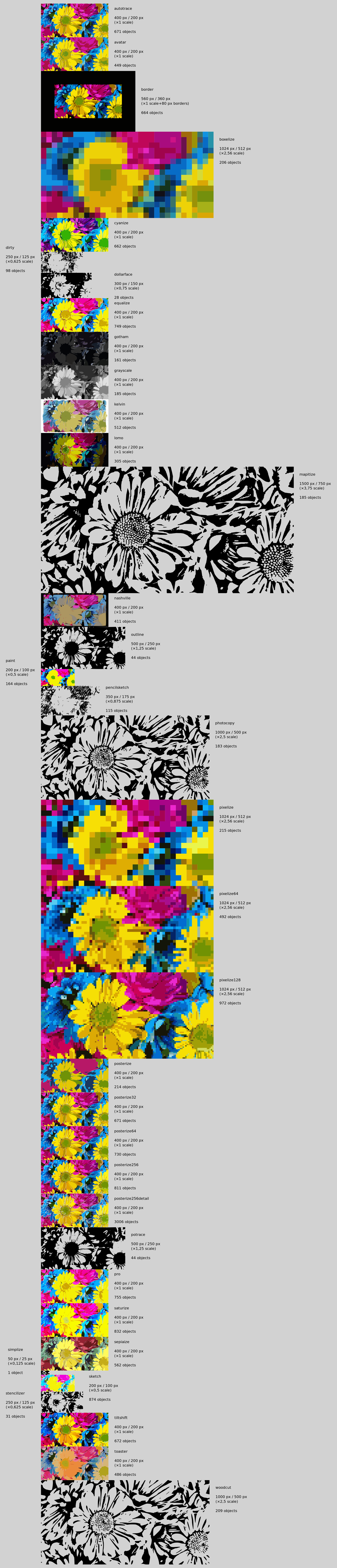 Tags: autotrace, avatar, border, boxelize, cyanize, dirty, dollarface, equalize, gotham, grayscale, kelvin, lomo, mapitize, nashville, outline, paint, pencilsketch, photocopy, pixelize, pixelize64, pixelize128, posterize, posterize32, posterize64, posterize256, posterize256detail, potrace, pro, saturize, sepiaize, simplize, sketch, stencilize, tiltshift, toaster, woodcut, 2015, collection, color, colour, compare, filter, floric, flower, lazur, list, margaret, test, upload filter testing, urh, vectorized, background blurry