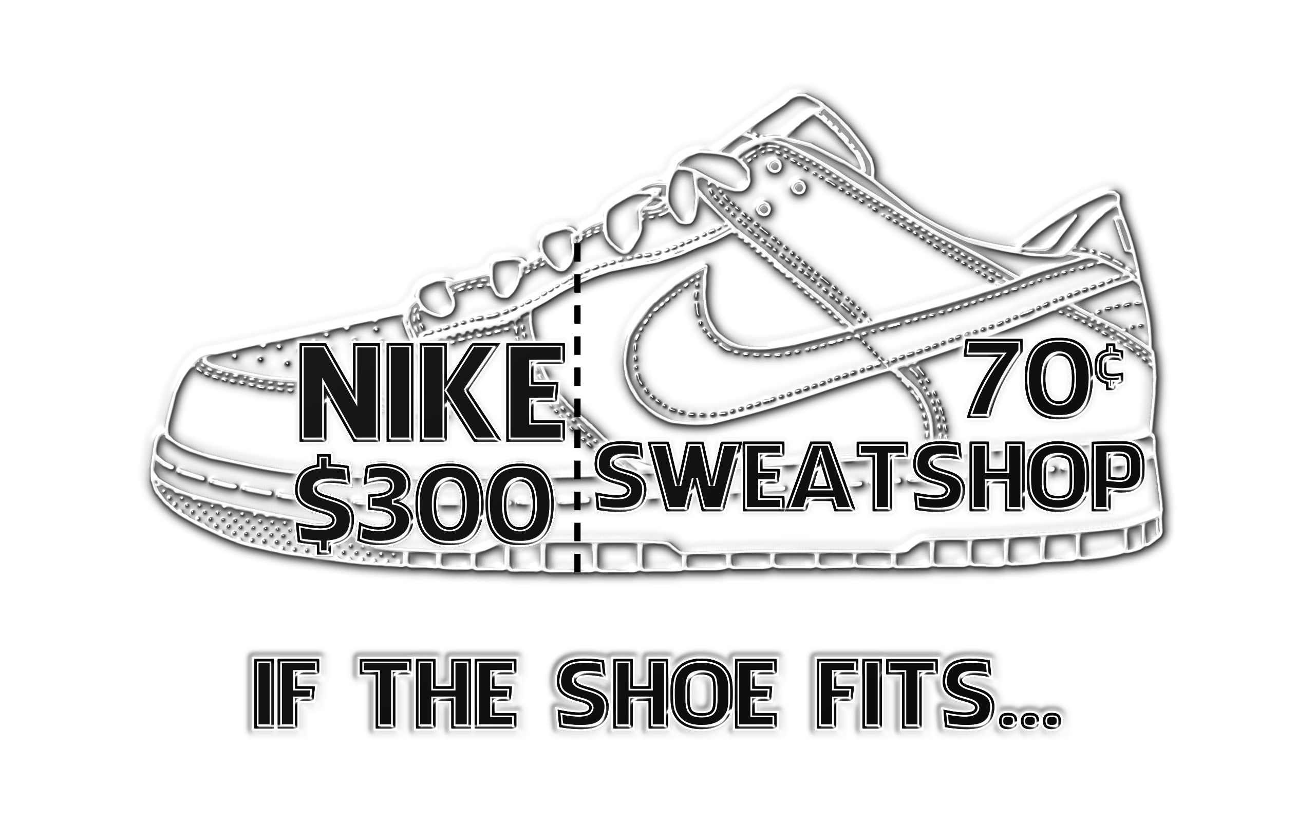 This features a pair of Nike shoes, which are prominently displayed in the foreground. They are seen from the side and have a white and gray color scheme. Above the shoes, there is a text that reads "Nike $300, 70 Sweatshop; If the shoe fits...". The text is black in color, making it stand out against the background of the image.