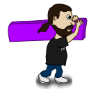 This features a man with a beard and mustache, wearing a black shirt. He is holding a purple bar on his shoulder while looking upwards. The man appears to be in the middle of an action scene or possibly posing for a comic strip. His attire suggests that he might be a character from a cartoon or comic book.