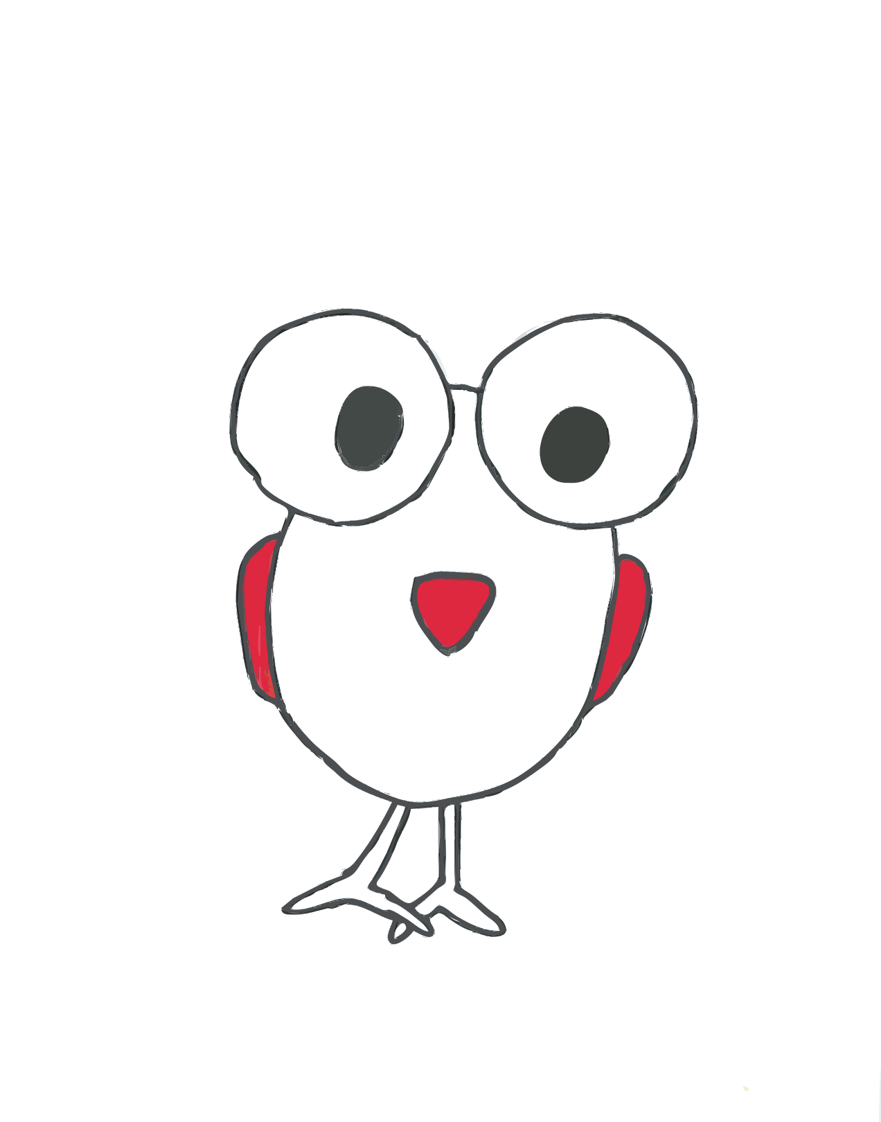 This features a cartoon-like drawing of a bird with glasses, giving it an amusing and quirky appearance. The bird is wearing red glasses and has a beak that is also colored red. Its wings are also painted in the same shade of red. The bird's eyes are quite large, making them stand out even more against its white body. This whimsical drawing captures the viewer's attention with its unique and playful design.