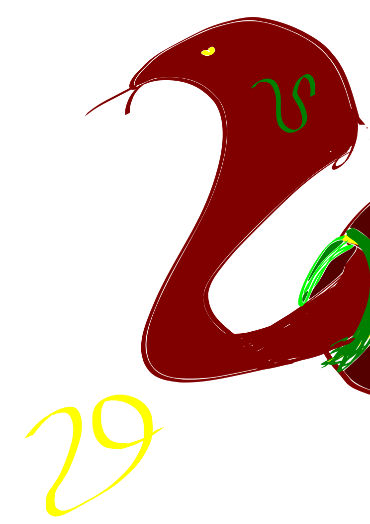 This features a red and green snake with yellow numbers on its head. It appears to be an artistic drawing, possibly done using a calligraphy tool or other creative means. The snake's body is curled up in the shape of a number 29, adding a unique touch to the design. The colors used for the snake are predominantly red and green, with yellow accents on its head. Overall, it seems like an interesting and eye-catching piece of artwork that incorporates both nature's elements and numbers into its composition.