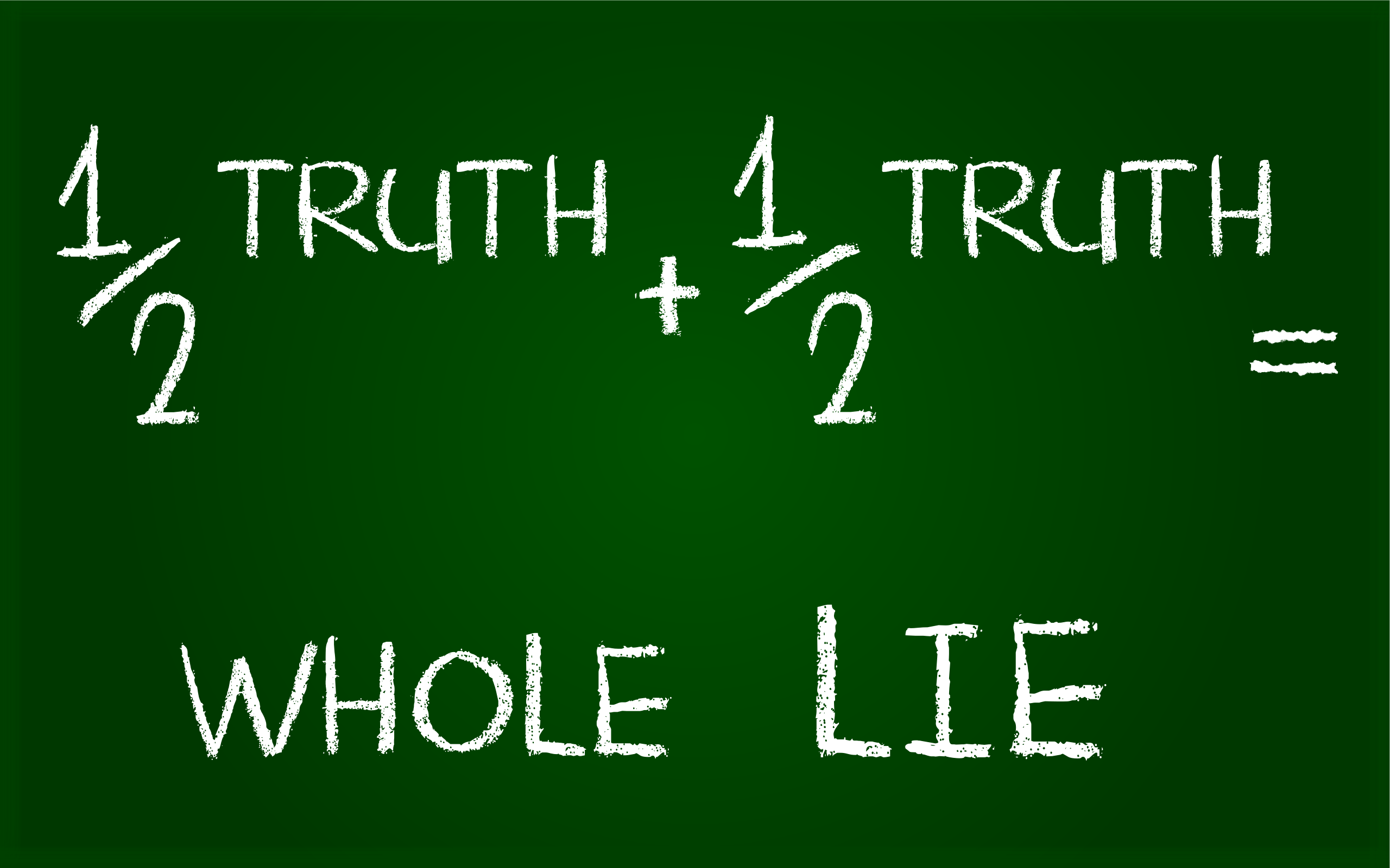 This features a green chalkboard with white writing on it. The text reads "1 truth + 2 truth = whole lie." This equation is written in a way that makes the statement seem ironic or contradictory, as it suggests that adding two equal parts of truth results in a lie. The chalkboard appears to be used for educational purposes, possibly to teach about the concept of half-truths and their implications.