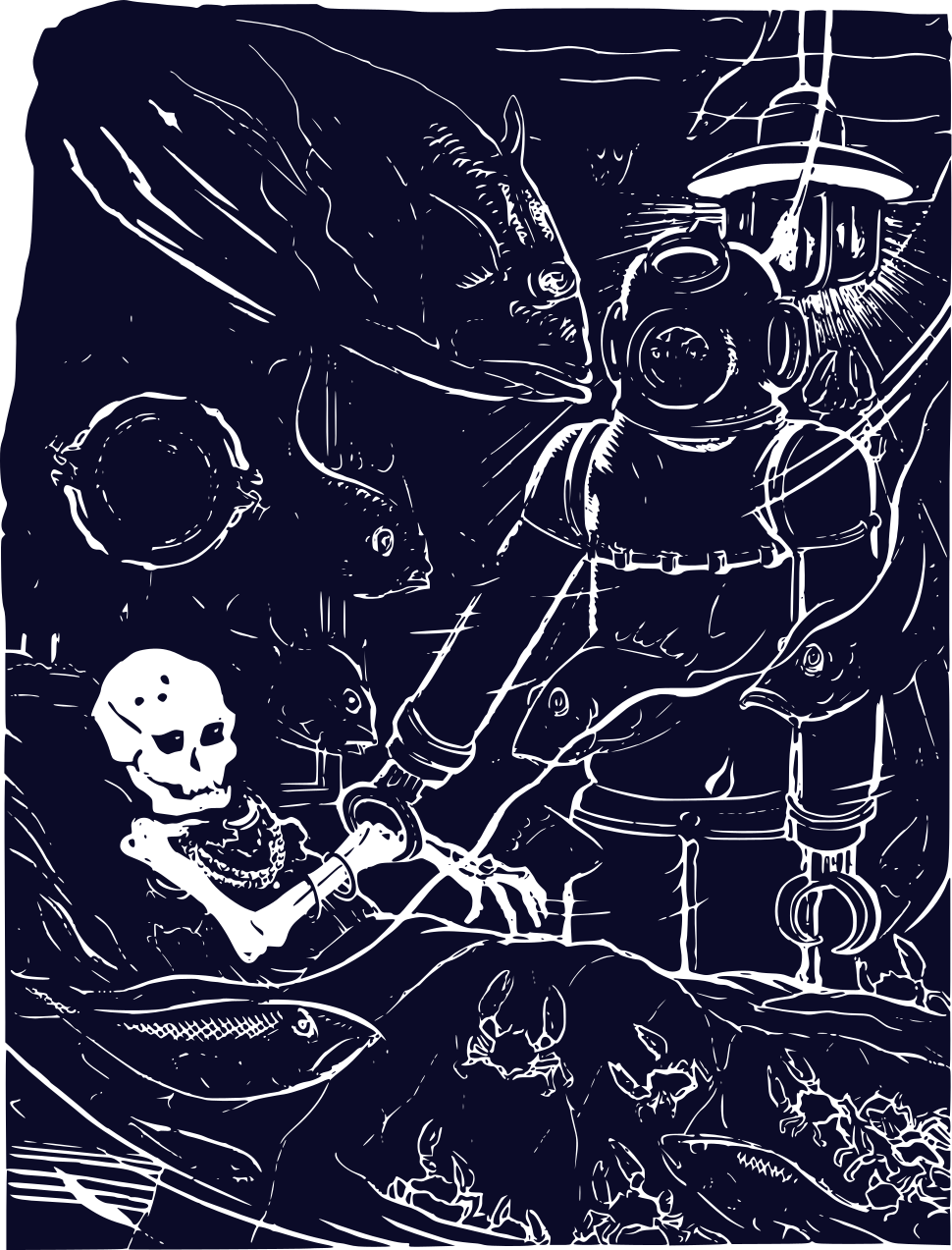 This features a black and white drawing of a man in a diving suit, standing next to a skeleton. The skeleton appears to be wearing a gas mask, which is an interesting detail in the scene. In addition to the main subjects, there are several other smaller figures scattered throughout the image, adding depth and complexity to the artwork. The overall composition of the drawing creates a sense of intrigue and mystery, as it combines elements of human history with the fantastical world of skeletons and diving suits.