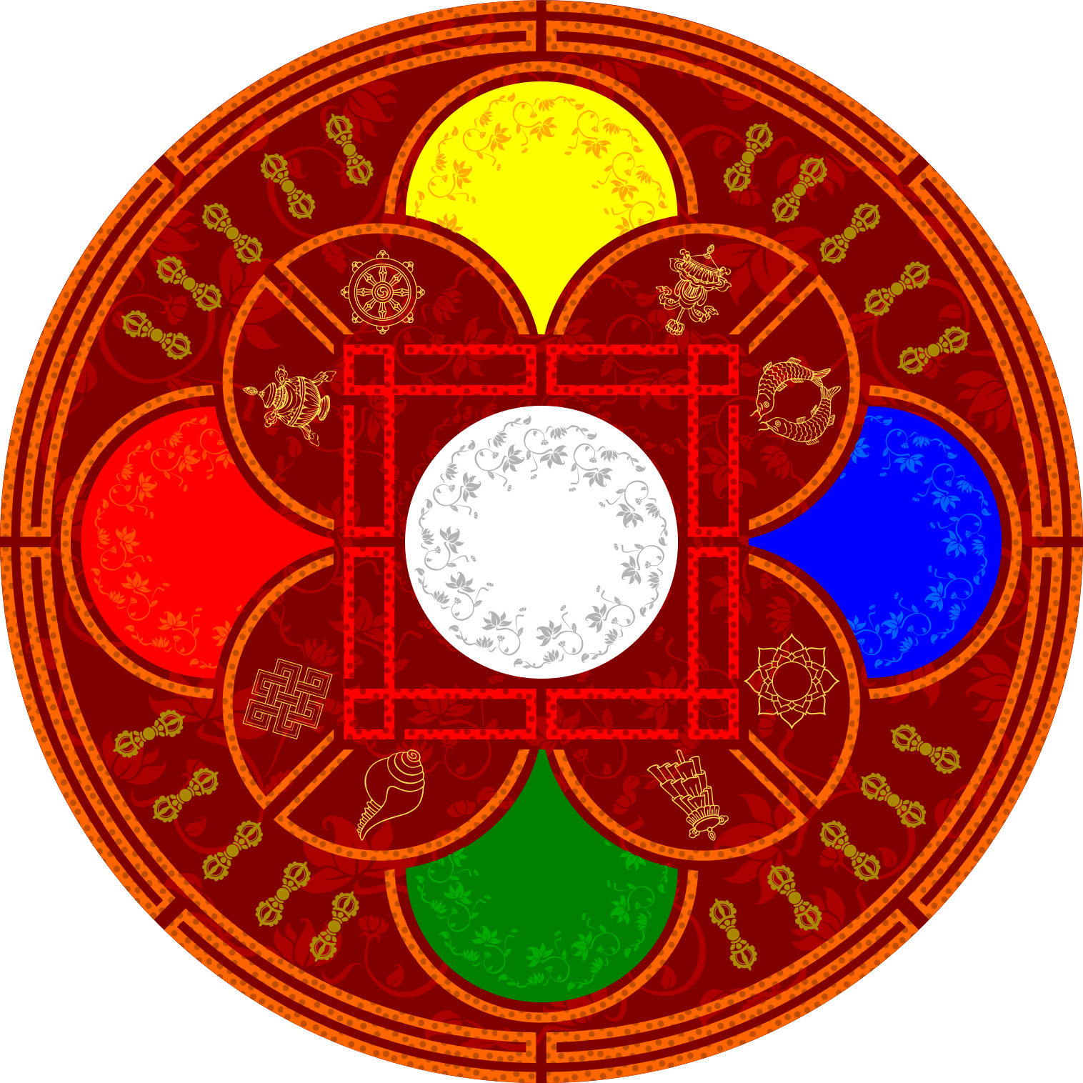 This features a colorful mandala with a red background and a white circle in the center. The mandala is divided into four sections, each featuring different colors: yellow, blue, green, and red. These colors are arranged in a circular pattern around the central white circle. In addition to the main circle, there are several smaller circles scattered throughout the image, adding more detail and visual interest to the overall design. The mandala appears to be an intricate and vibrant piece of artwork that showcases the beauty of color and symmetry.