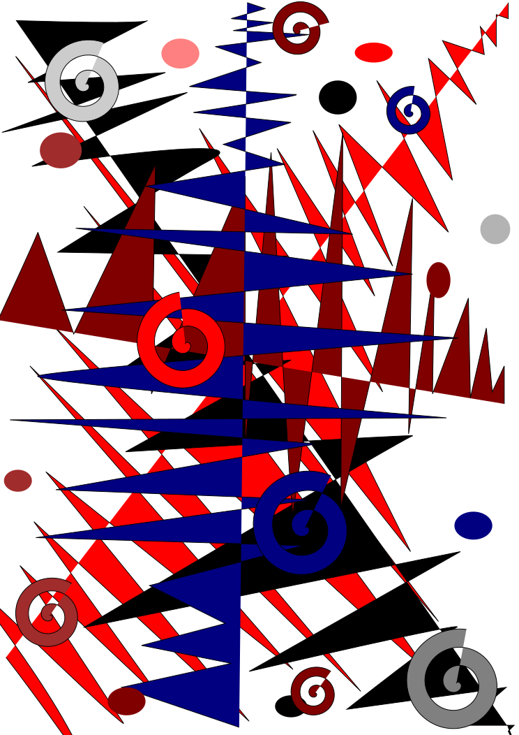 This is a colorful and abstract design featuring red, orange, black, blue, and white colors. It consists of many sharp-edged lines that create an intricate pattern. There are also several circles scattered throughout the design, adding to its visual interest. The overall effect is a vibrant and dynamic piece of artwork that captures the viewer's attention with its bold colors and unique patterns.