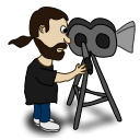 This features a cartoon character, possibly a bearded man or a boy, holding a camera and looking at it. He appears to be focused on the camera's lens, possibly examining its function or preparing for a shot. The character is wearing a black shirt, which adds to his overall appearance. The scene takes place in front of a tripod, suggesting that this cartoon figure might be involved in filmmaking or photography.