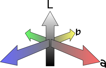 This displays a three-dimensional representation of the CIE Lab color space, which is used to describe colors in terms of their lightness (L), a* and b*. This visualization uses perspectival arrows and labels to help understand the relationships between these different aspects of color. The arrows are pointing in various directions, indicating the different dimensions of the color space. There are also letters A, B, L, and C on the image, which may be used as reference points or labels for specific areas within the color space. Overall, this visual representation provides a clear understanding of the complex relationships between lightness, a* and b* in the context of color perception.