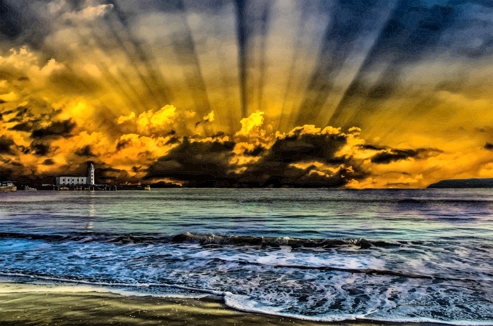 This captures a beautiful sunset over the ocean, with rays of light peeking out from the clouds. The sky is filled with vibrant colors and the sun's rays create an illusion of shining through the clouds. In the distance, there is a white lighthouse attached to a building, which adds a sense of depth and perspective to the scene. The ocean itself appears calm and serene, providing a peaceful atmosphere for this picturesque moment.