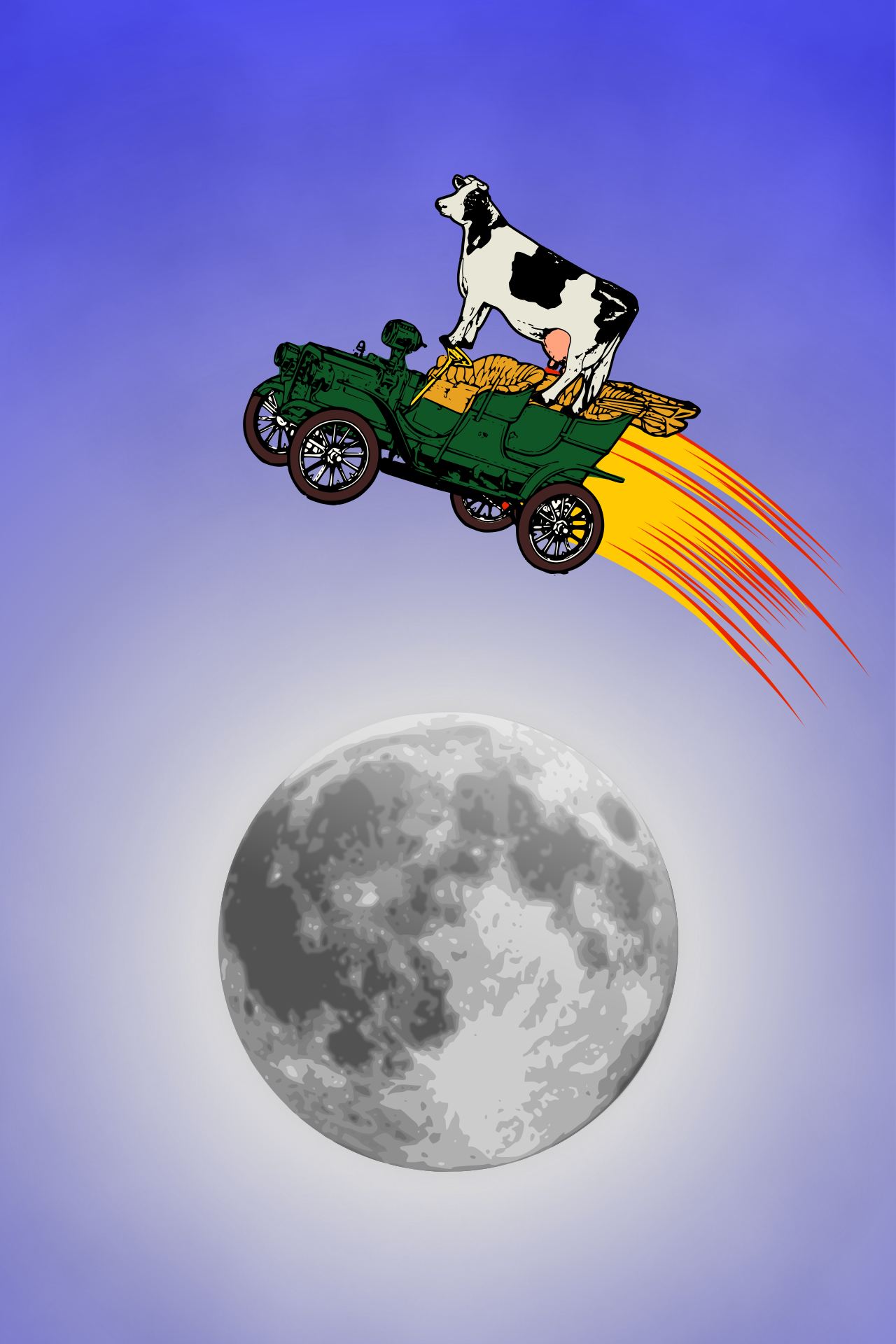 This features a cow sitting on top of an old-fashioned green car, which is flying through the air. The car appears to be powered by a rocket, giving it a unique and whimsical appearance. The cow seems to be enjoying its ride as they soar together in the sky. The scene takes place against a backdrop of a moon, adding an element of depth and interest to the image.