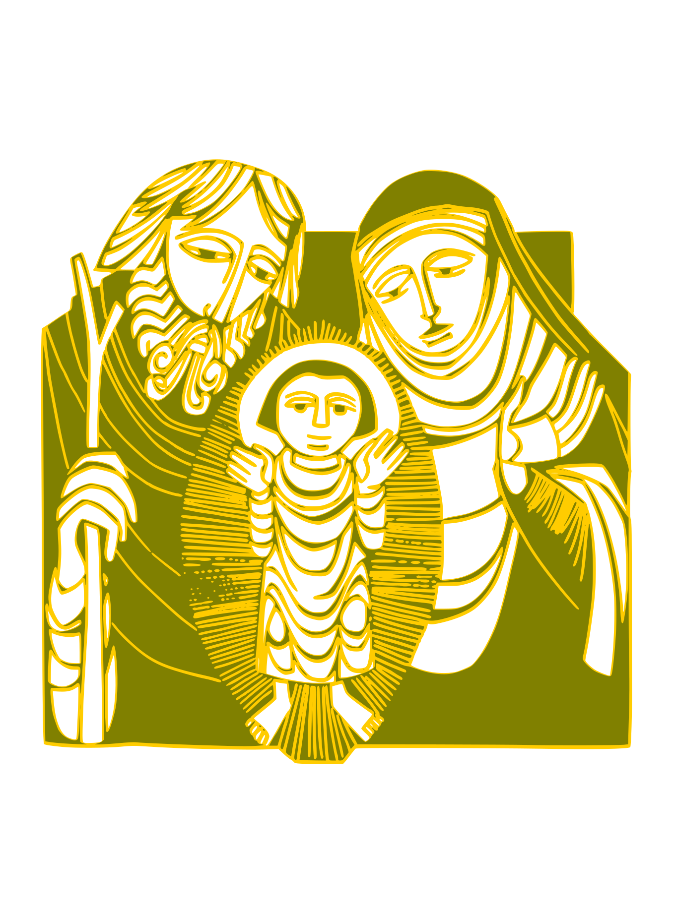This features a beautifully crafted artwork of an infant Jesus, surrounded by two people who appear to be his parents. The art is painted in shades of yellow color, giving it a warm and inviting appearance. The baby is positioned at the center of the scene, with one person on each side holding him close. The image captures a tender moment between the family members, showcasing their love and devotion to the child.
