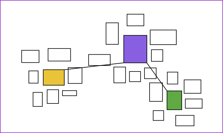 This features a complex network of interconnected boxes, with various colors and shapes. There are three main colored boxes in the scene: yellow, purple, and green. These boxes have lines extending from them, connecting to other boxes within the network. The arrangement creates an intricate web-like pattern that showcases the relationships between these individual boxes. This image could be a visual representation of a concept or idea, with each box symbolizing a different aspect or component.