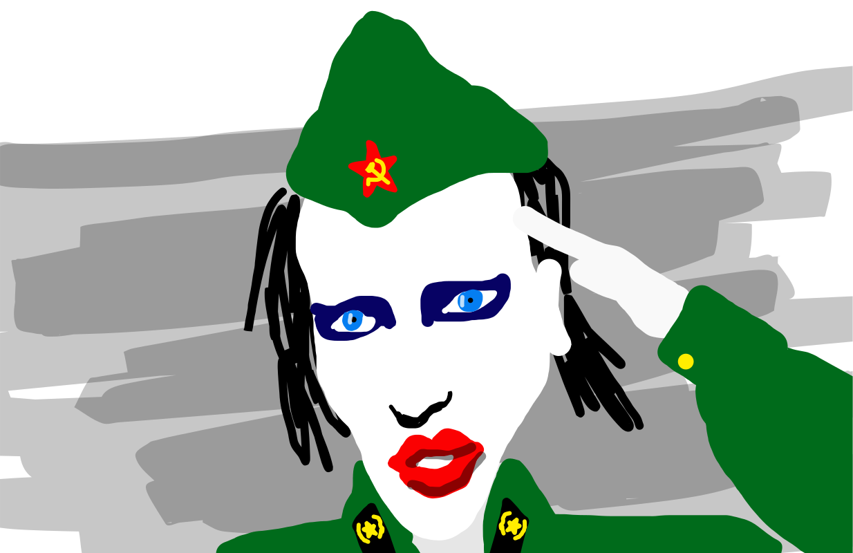 This features a person wearing a green uniform and saluting, with their face painted white and adorned with dark makeup around the eyes. They are also wearing lipstick, giving them an unusual appearance. The background is blurry, creating a sense of depth in the scene. This unique individual appears to be a mix between Marilyn Manson and a military figure, making for an interesting and intriguing visual.