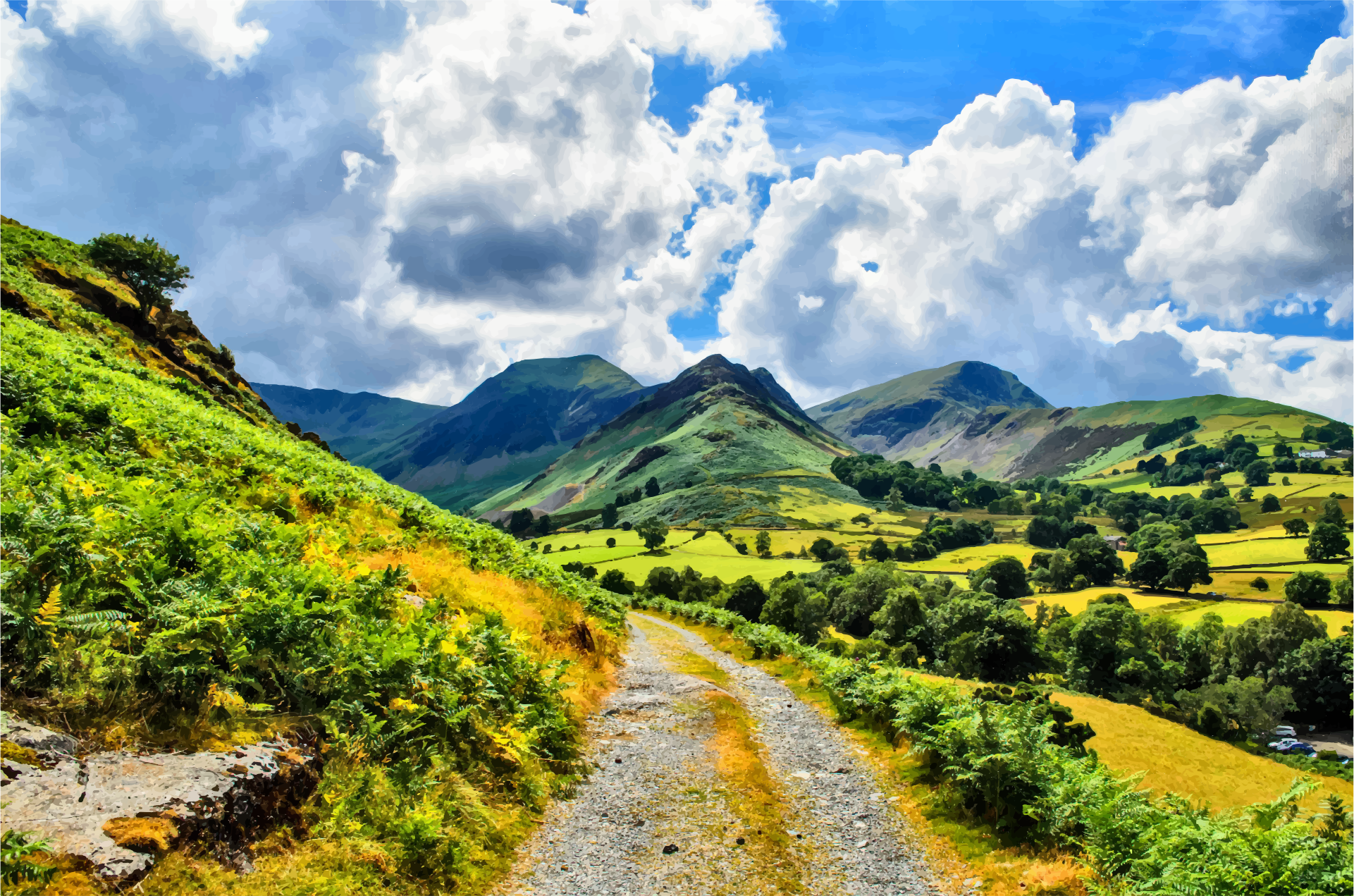 This features a picturesque landscape with a dirt road surrounded by lush green hills. The road is located in the middle of the scene, and it appears to be leading towards a mountainous area. The mountains are visible in the background, creating an impressive backdrop for the serene countryside. In addition to the main road, there are several smaller roads branching off from it, indicating that this location is likely a popular spot for exploration and outdoor activities. The overall atmosphere of the scene suggests a peaceful retreat away from urban life, where one can enjoy nature's beauty and tranquility.