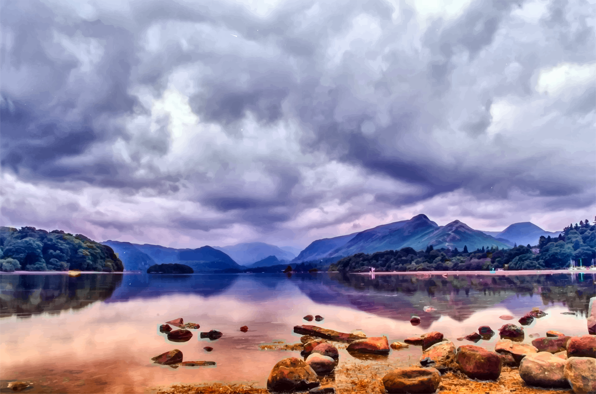 This features a serene lake surrounded by mountains, with the sky above appearing cloudy and gray. The water is calm, reflecting the landscape around it. There are several rocks scattered throughout the scene, some of which are located near the shoreline while others are further out in the water. A few boats can be seen floating on the surface of the lake, adding to the peaceful atmosphere. Overall, this picturesque scene captures a moment of tranquility and natural beauty.