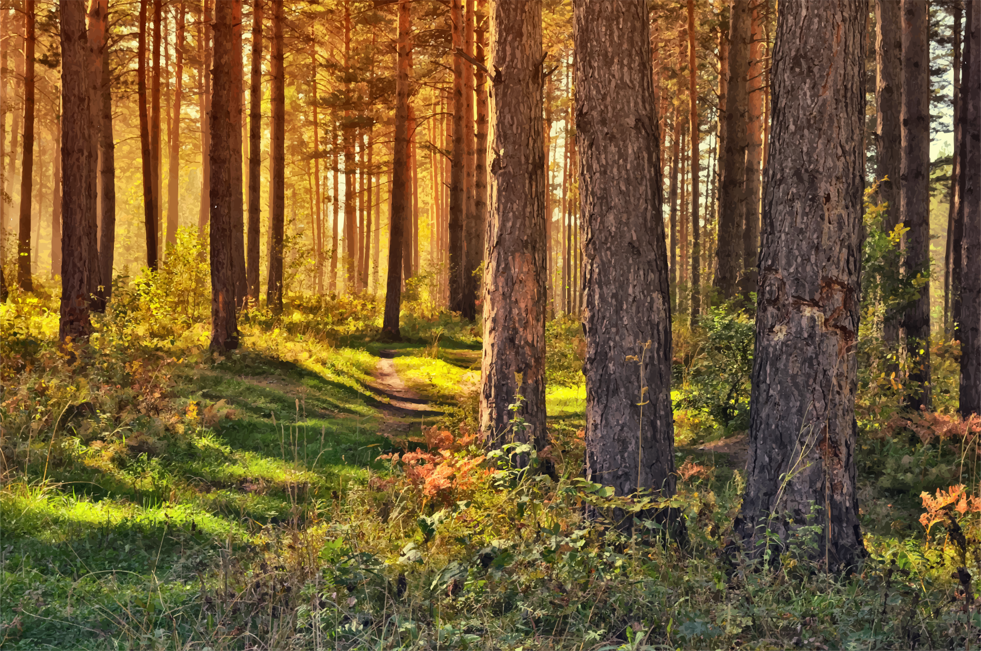 This depicts a serene forest scene with tall trees and sunlight filtering through the branches. The pathway is surrounded by lush greenery, creating an atmosphere of tranquility. There are several pine trees in the foreground, while others can be seen further back in the distance. A few people are scattered throughout the scene, possibly enjoying a leisurely walk or taking in the beauty of nature. The combination of sunlight and shadows cast by the trees creates an idyllic setting that evokes feelings of peacefulness and relaxation.