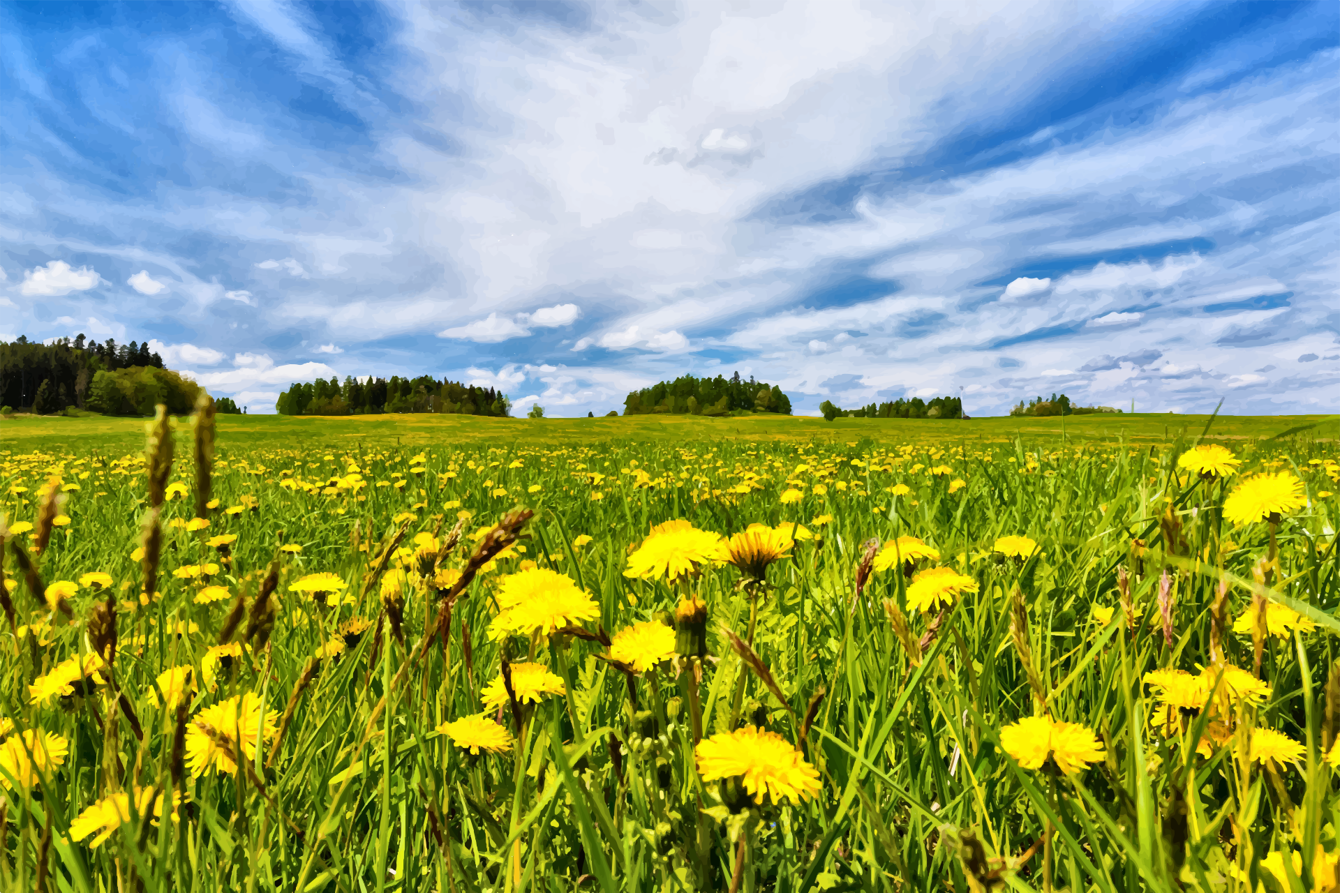 This features a large, open field filled with yellow flowers. These flowers are scattered throughout the field in various positions and sizes, creating a vibrant and lively atmosphere. The field is also green, adding to the overall beauty of the scene. In addition to the flowers, there are trees visible in the background, providing a sense of depth and perspective to the image. Overall, it's an idyllic and picturesque view of nature at its finest.