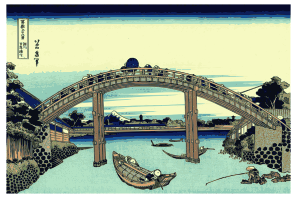 This is a traditional Japanese woodblock print titled "Under Mannen Bridge at Fukagawa" (深川万年橋下), which is part of the famous series "Thirty-six Views of Mount Fuji." The scene features a bridge crossing over a river, with several boats floating on the water. There are also people in the image, some of whom appear to be fishing or enjoying their time by the river. The print showcases the beauty and tranquility of nature, as well as the cultural significance of bridges and rivers in Japanese art. The use of traditional techniques and colors highlights the historical context of this artwork, which was created during the Edo period (1603-1867) when ukiyo-e prints were at their peak popularity.