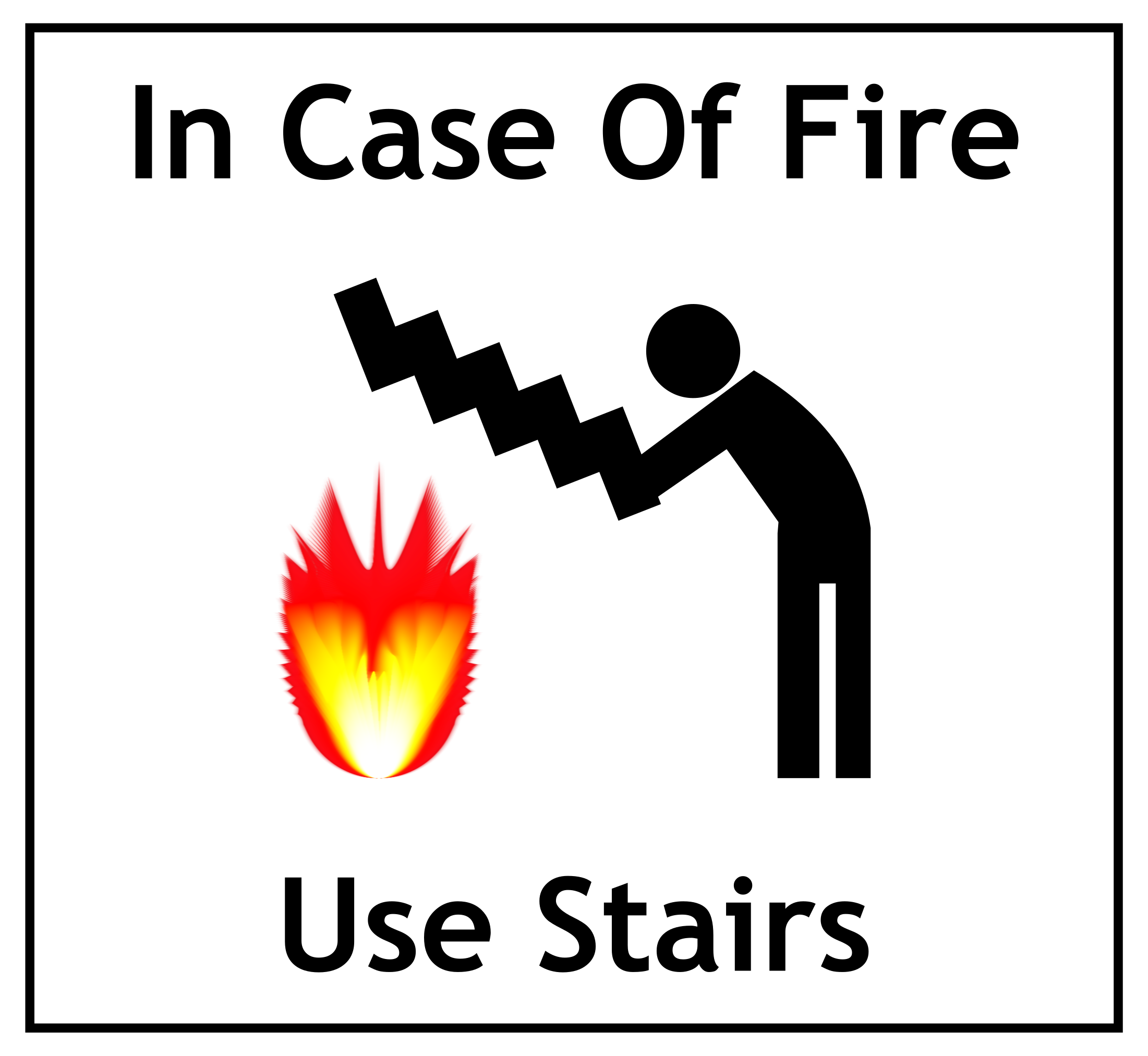 This features a parody fire sign with the text "In Case Of Fire Use Stairs." A man is depicted using stairs to put out a fire, which appears as an orange flame. The scene is illustrated in black and white, giving it a classic feel. The sign serves as a reminder for people to use stairs instead of elevators during emergencies like fires.