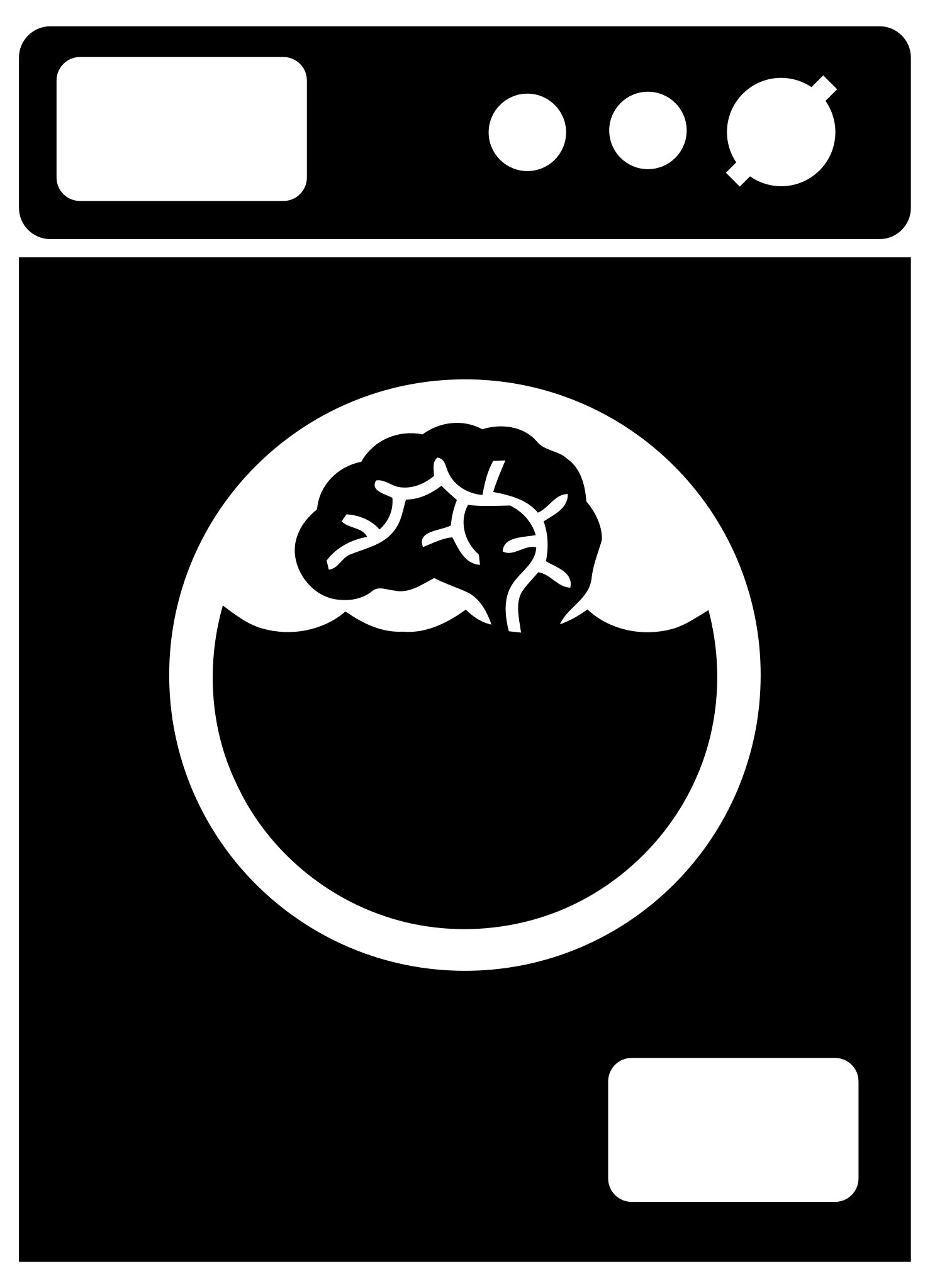 This features a black and white illustration of a human brain inside an open washing machine. This creative representation symbolizes the concept of "brainwashing" or the idea that one's thoughts, beliefs, or values can be influenced or altered by external forces. The brain is depicted in the center of the image, surrounded by the washing machine's interior components such as the drum and the spin cycle. This unique visual juxtaposition of a human organ with an everyday household appliance creates an intriguing and thought-provoking piece of art or design.