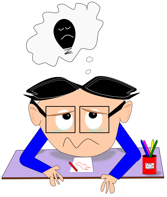 This features a man sitting at a desk, wearing glasses and looking sad. He is holding a pen in his hand while working on a piece of paper. Above the man's head, there is a thought bubble with a frowning face inside it, indicating that he might be deep in thought or contemplating something. The desk has various items placed on it, including a cup and a book. Additionally, there are two bottles located near the edge of the desk.