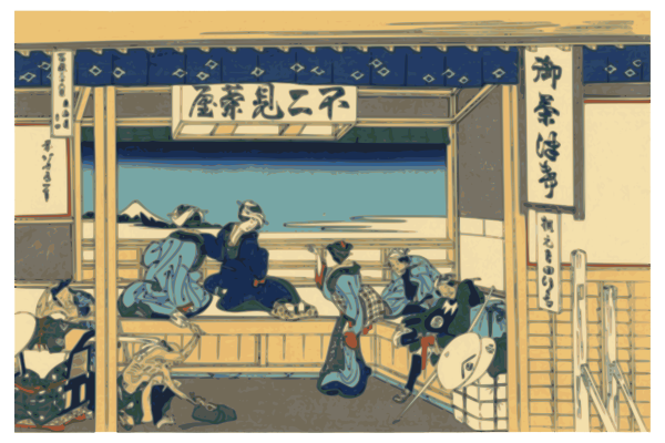 This depicts a group of people gathered in an outdoor area, possibly at a restaurant or market. They are sitting and standing around a large window that offers a beautiful view of Mount Fuji. There are several individuals engaged in conversation with each other, creating a lively atmosphere. Some of the people are seated on benches while others stand nearby. The scene is bustling with activity as everyone seems to be enjoying their time together and taking in the breathtaking scenery.