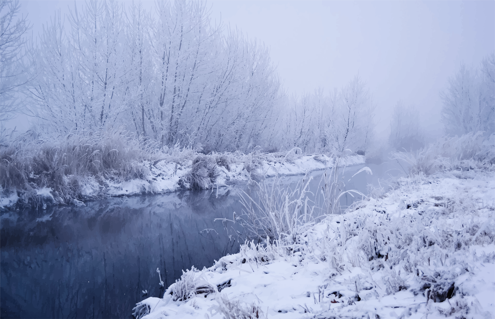 This depicts a serene winter scene with a river surrounded by snow-covered trees and bushes. The water appears to be calm, reflecting the tranquil atmosphere of the landscape. The trees on the left side of the river are covered in white snow, creating a picturesque view. The overall setting evokes feelings of peacefulness and quietness as nature embraces the cold season.