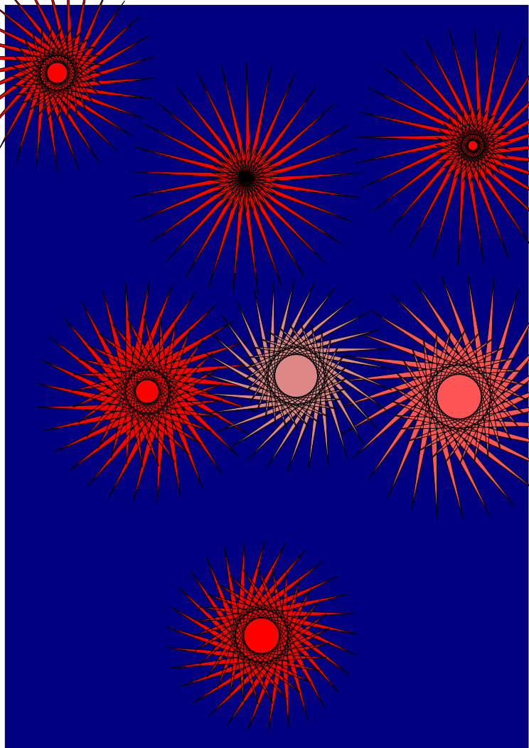 This features a blue background with several red and orange flowers scattered throughout the scene. These flowers are of various sizes, creating an interesting visual effect. Some of the flowers have a more prominent appearance, while others are smaller and less noticeable. Overall, the combination of colors and shapes creates a vibrant and lively atmosphere in the image.