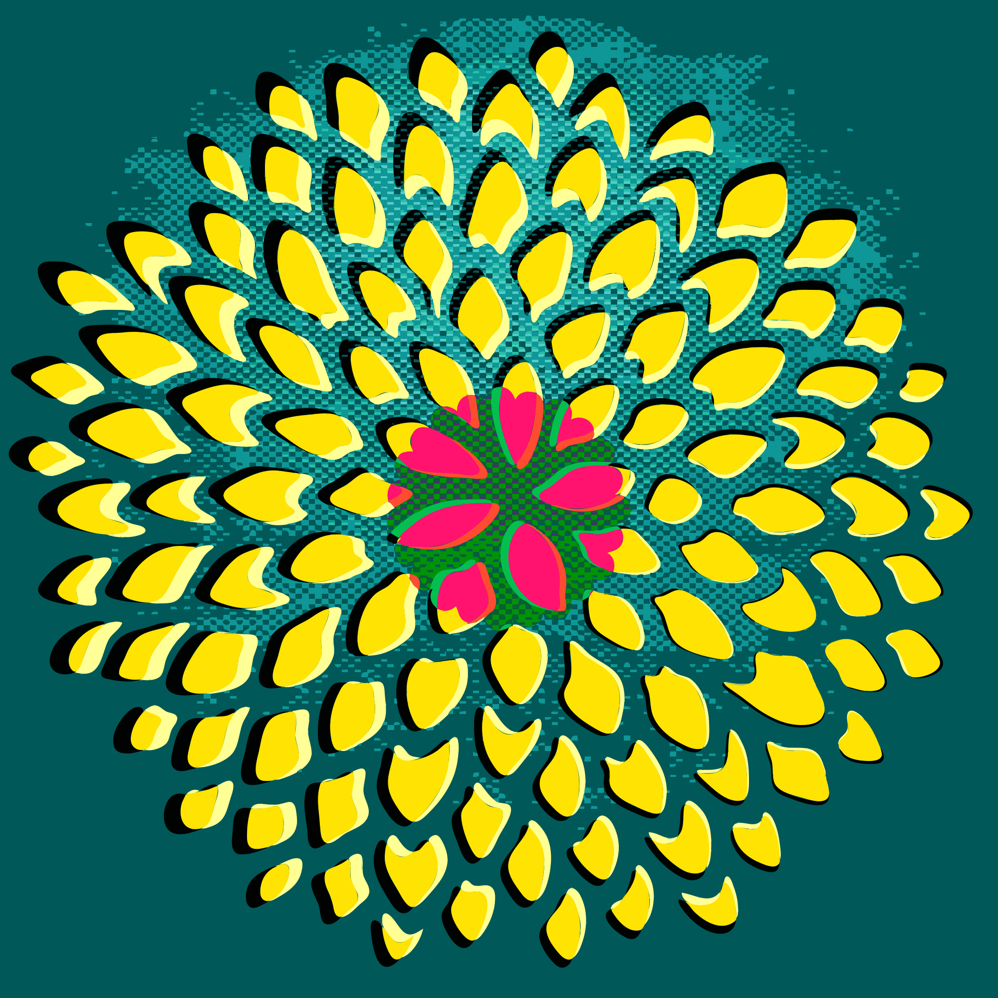 This features a large, colorful flower with yellow petals and a pink center. The flower is surrounded by numerous smaller flowers, creating an intricate pattern that fills the entire frame of the picture. The combination of vibrant colors and detailed design makes this artwork visually appealing and captivating.