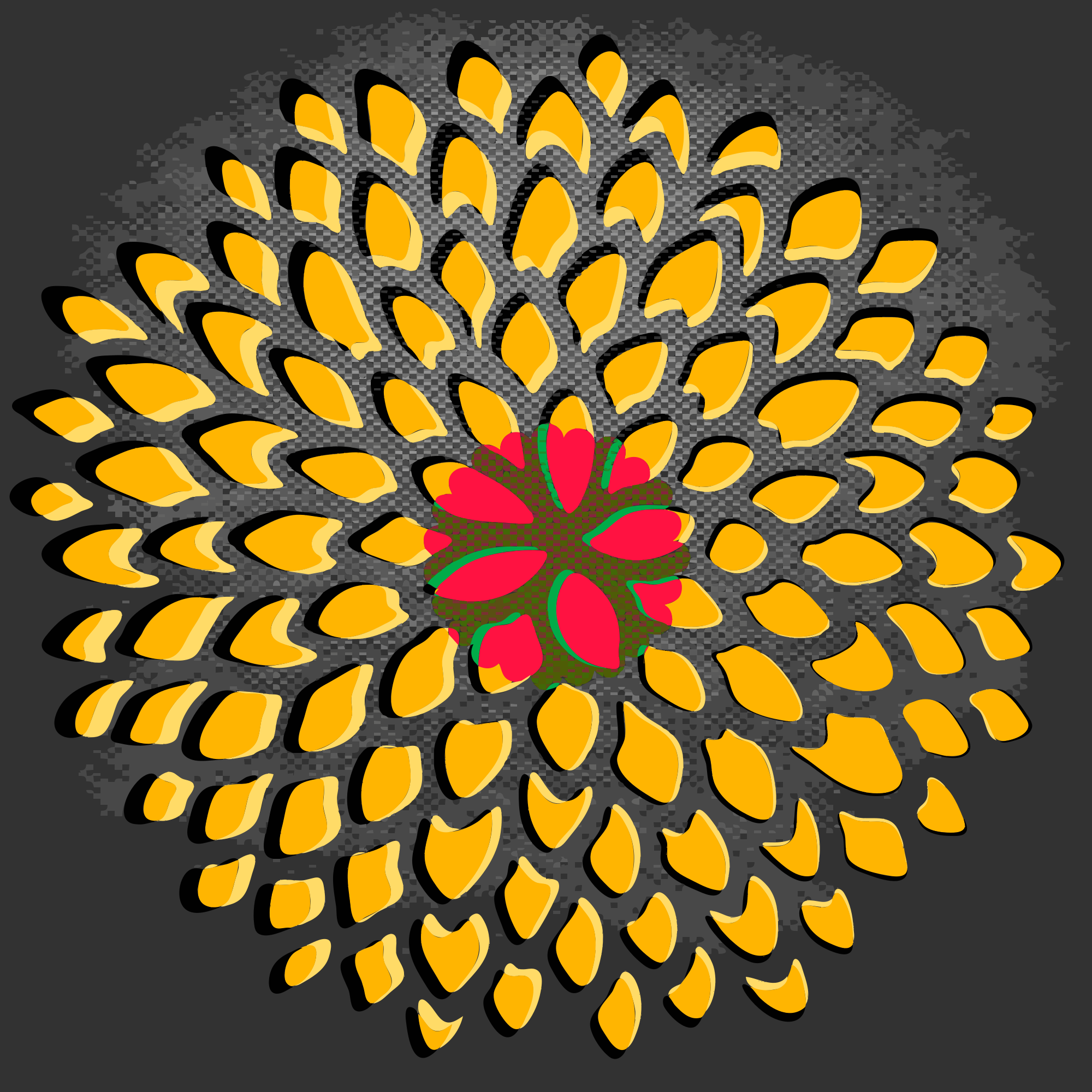 This features a unique and colorful design, which appears to be an artistic representation of a flower. The petals are yellow in color, creating a vibrant contrast against the background. In the center of this flower-like pattern, there is a red circle that stands out prominently. This central element adds depth and interest to the overall composition. The design appears to be composed of many individual petal shapes, which come together to form the larger flower shape. Overall, it's an intriguing and visually appealing piece of artwork.