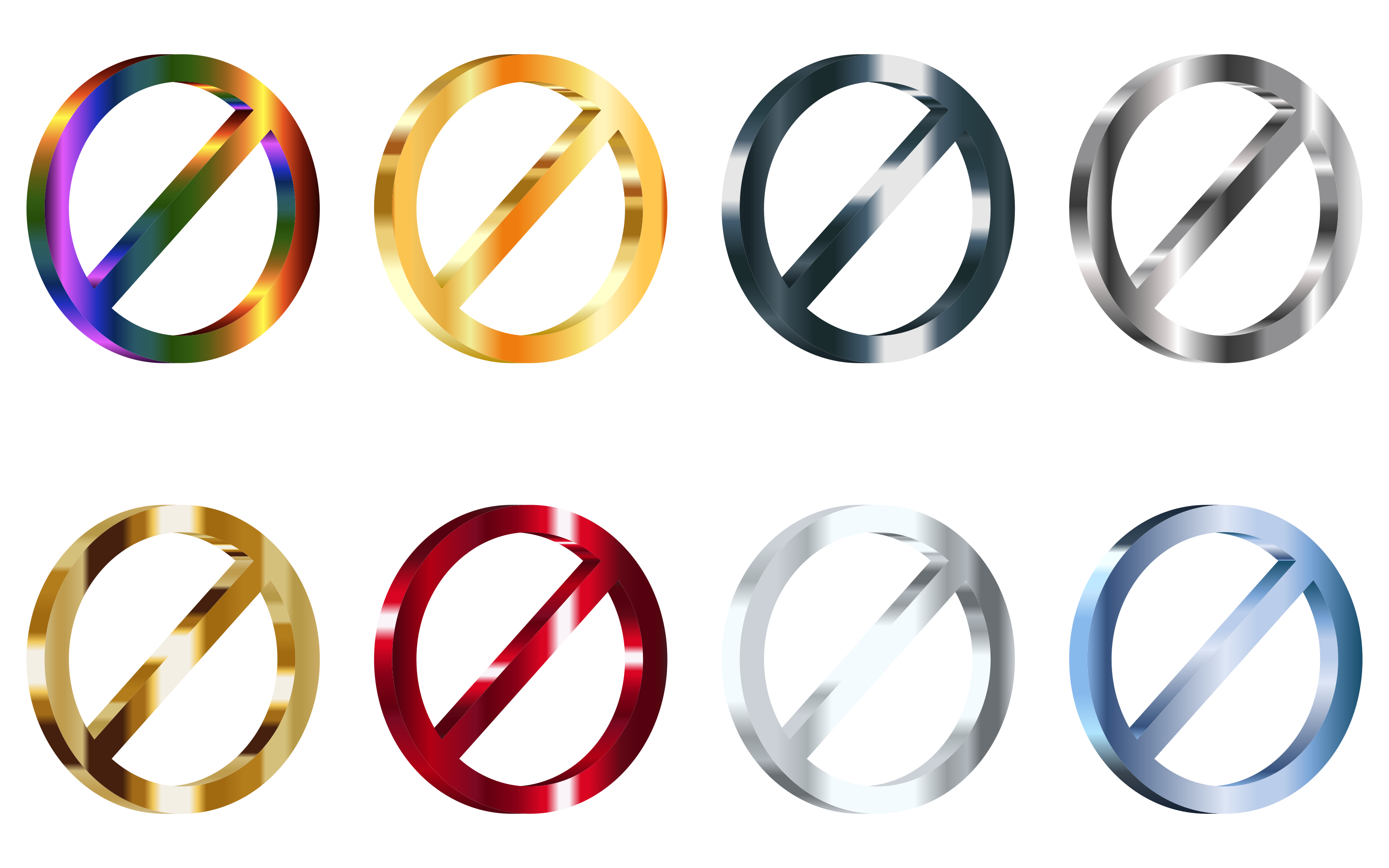 This features a collection of six different colored rings, each with a "no" symbol on them. These rings are arranged in a row and appear to be made of metal. They come in various colors such as red, blue, yellow, silver, gold, and white. Each ring is unique and distinct from the others, showcasing their individual designs and colors. The arrangement of these rings creates an interesting visual display that highlights each ring's distinctive appearance.