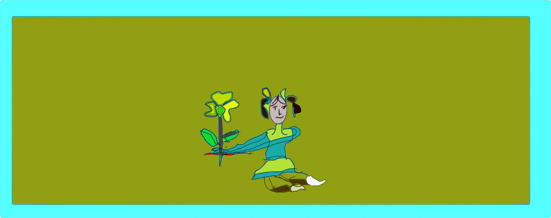 This features a cartoon character, possibly a girl or woman, sitting on the ground and holding a yellow flower. She is wearing a blue dress and appears to be enjoying her time outdoors. The scene takes place against a backdrop of a green wall, which adds a vibrant touch to the overall composition. The cartoon character's presence in this setting creates an interesting juxtaposition between the real world and the imaginative world of comic books or animated films.