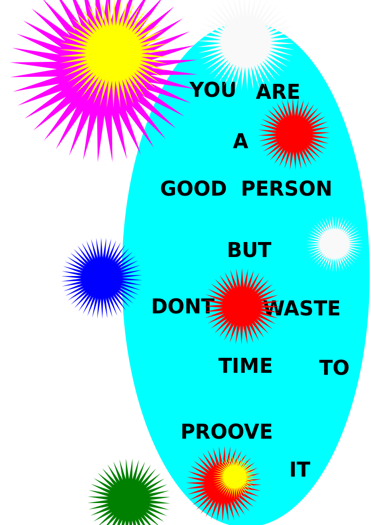 This is a colorful and creative poster that features a blue circle with the words "you are a good person, but don't waste time to prove it." Inside the blue circle, there are several brightly colored balls scattered around. These balls come in various shades of pink, yellow, green, red, and blue, adding vibrancy and visual interest to the poster. The combination of the colorful balls and the motivational message creates a unique and eye-catching design that can inspire positive thinking and self-reflection among those who view it.