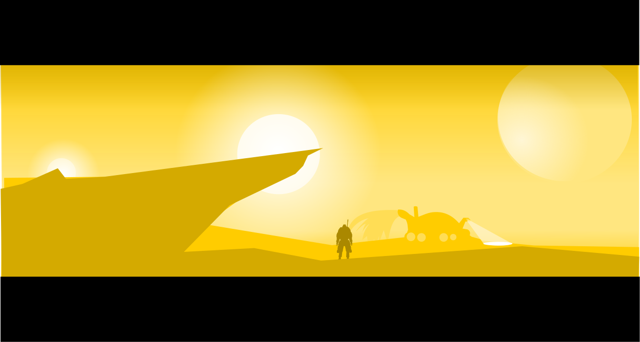 This features a person standing in the middle of an open, yellow desert. They are positioned near a cliff that has a glowing sun behind it, creating a striking contrast against the backdrop. In addition to the main figure, there is another person visible further away on the right side of the scene. The overall atmosphere suggests a sense of solitude and tranquility in this vast, natural landscape.