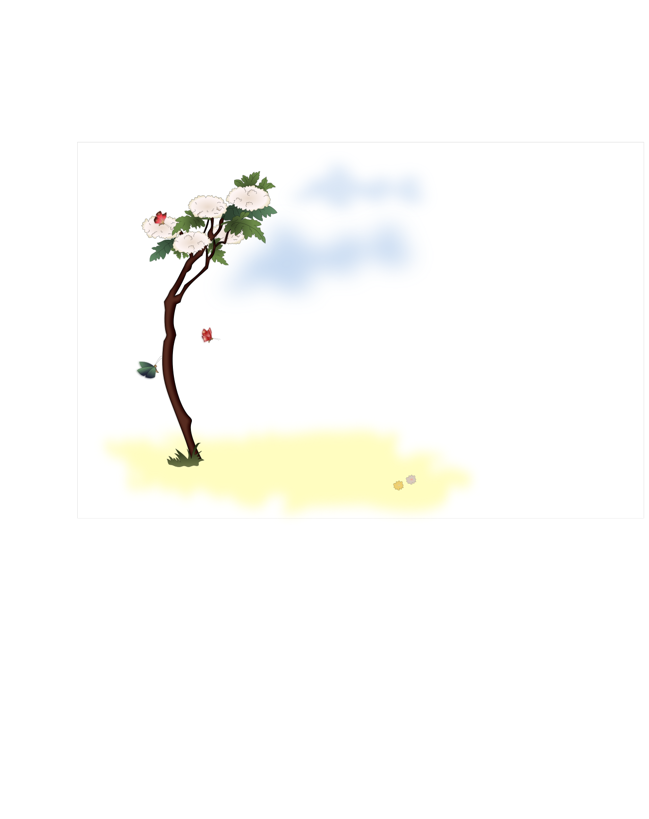 This features a tree with white flowers and red berries on it. It is situated in the middle of a field, surrounded by grass. There are several butterflies flying around the tree, adding to its lively atmosphere. The overall scene appears to be serene and picturesque, capturing the beauty of nature.