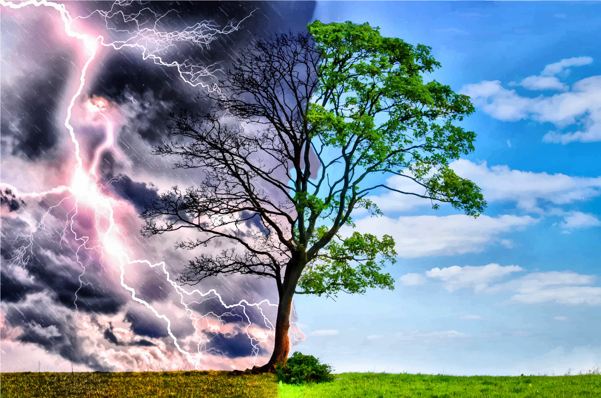 This features a striking contrast between two different weather conditions. On the left side, there is a stormy sky with lightning and dark clouds, while on the right side, it's a sunny day with clear skies. In the middle of this scene, there is a tree that has lost its leaves during the stormy weather but appears lush and green in the bright sunlight. The tree serves as a focal point between these two contrasting environments, highlighting the dramatic change in weather conditions.