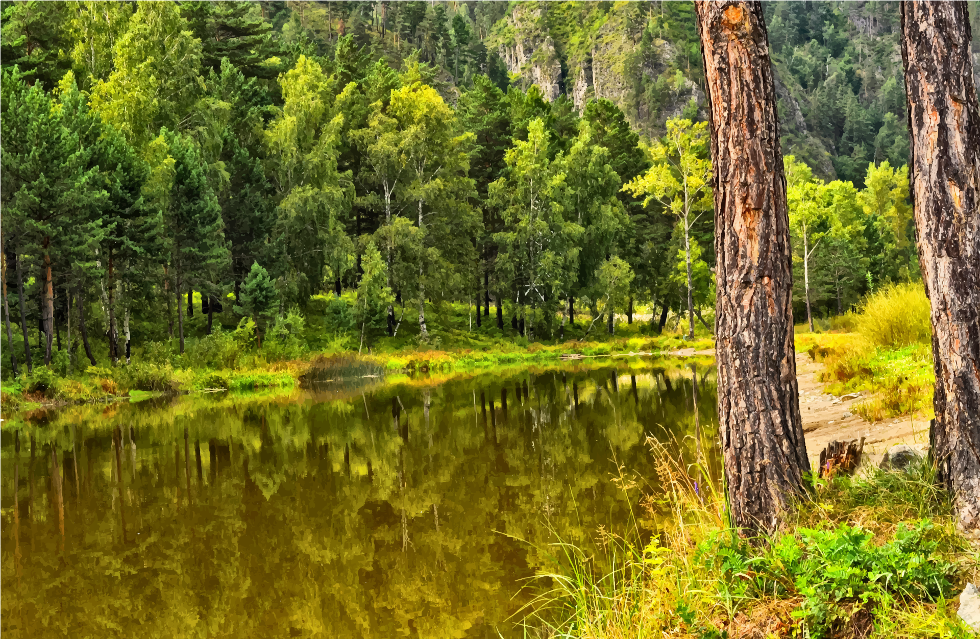 This features a serene scene of a lake surrounded by trees, with the water reflecting the surrounding forest. There are several pine trees in the area, adding to the natural ambiance of the scene. A few people can be seen scattered around the lake, enjoying the peaceful environment. Additionally, there is a bench situated near the edge of the lake, providing a place for visitors to sit and take in the view. The overall atmosphere of the image conveys tranquility and relaxation as one takes in the beauty of nature.